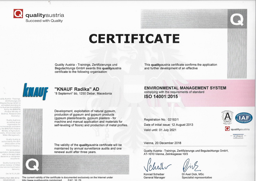 Политика за квалитет, безбедност и здравје при работа и животна средина на Кнауф Радика АД Дебар