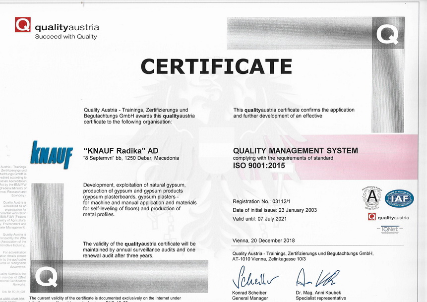 Највисокото раководство на нашата компанија ја утврдува Политика на Интегриран менаџмент систем со системите за управување со квалитет ISO 9001:2015, безбедност и здравје при работа ISO 45001:2018 и животна средина ISO 14001:2015. Одговорноста за спроведувањето, извршувањето и подобрување на политиката е на раководството, раководителите на сектори одговорните лица и секој поединечен вработен. Кнауф ќе осигура, квалитетот, безбедност при работа и заштита на човековата средина да се сметаат за приоритети и ќе ги информира сите вработени за Политиката. Во сите производни и продажни подрачја се поставуваат реални и следливи цели, се дефинираат клучните индикатори за имплементација на ИМС, се проценуваат ризиците и можностите и се превземаат соодветни мерки. Сите дејности и процеси се одвиваат во согласност со стандардите и законската регулатива.