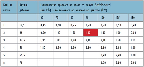 Пр. Две плочи Safeboard кај заштита на апарат за Рентген со напон на цевка од 90kV, се еквивалент на 1,4mm олово.