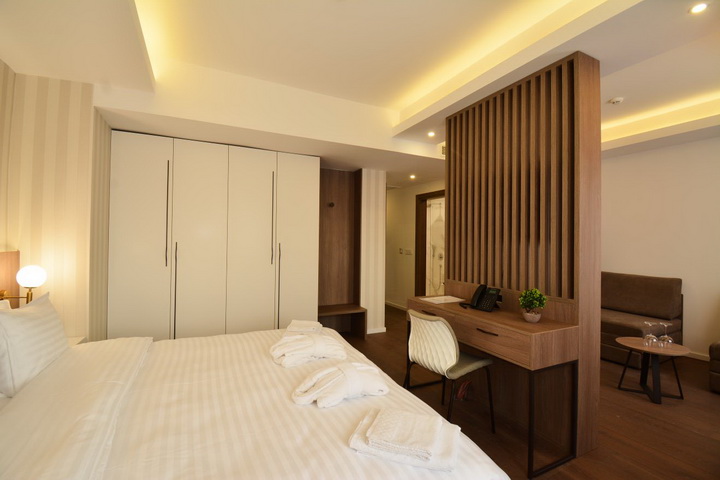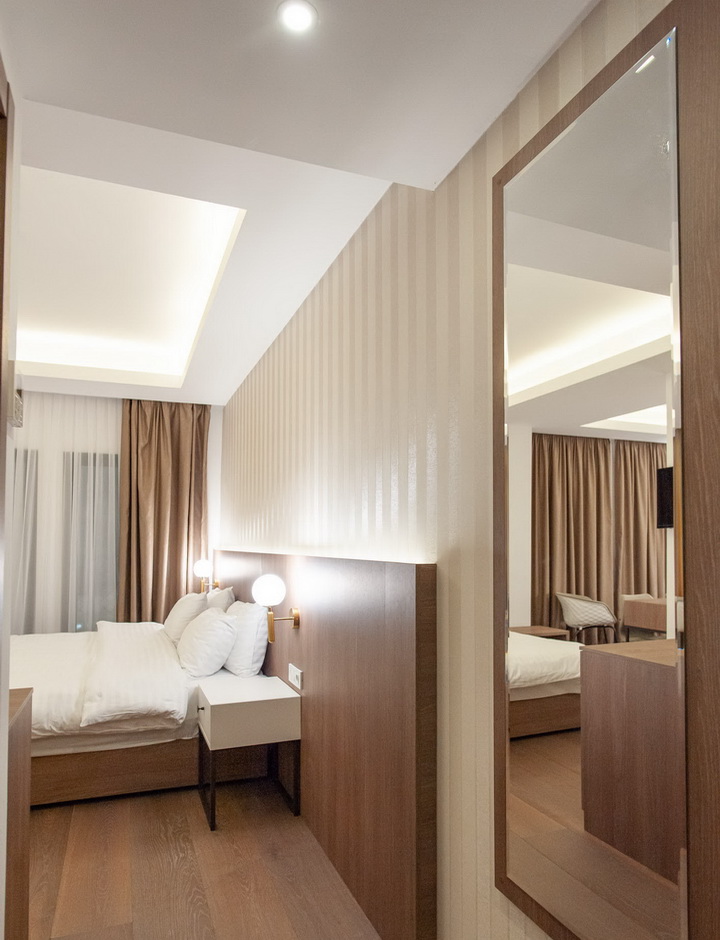 Внатрешноста, ослободена до самата конструкција, но и надградена, доби целосно нов распоред на простор, почитувајќи ги оптималните параметри на димензии, звучна, термичка и ПП-изолација на модерни хотелски соби.